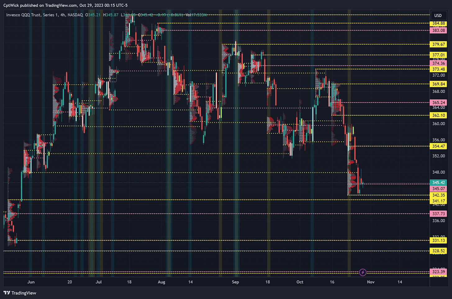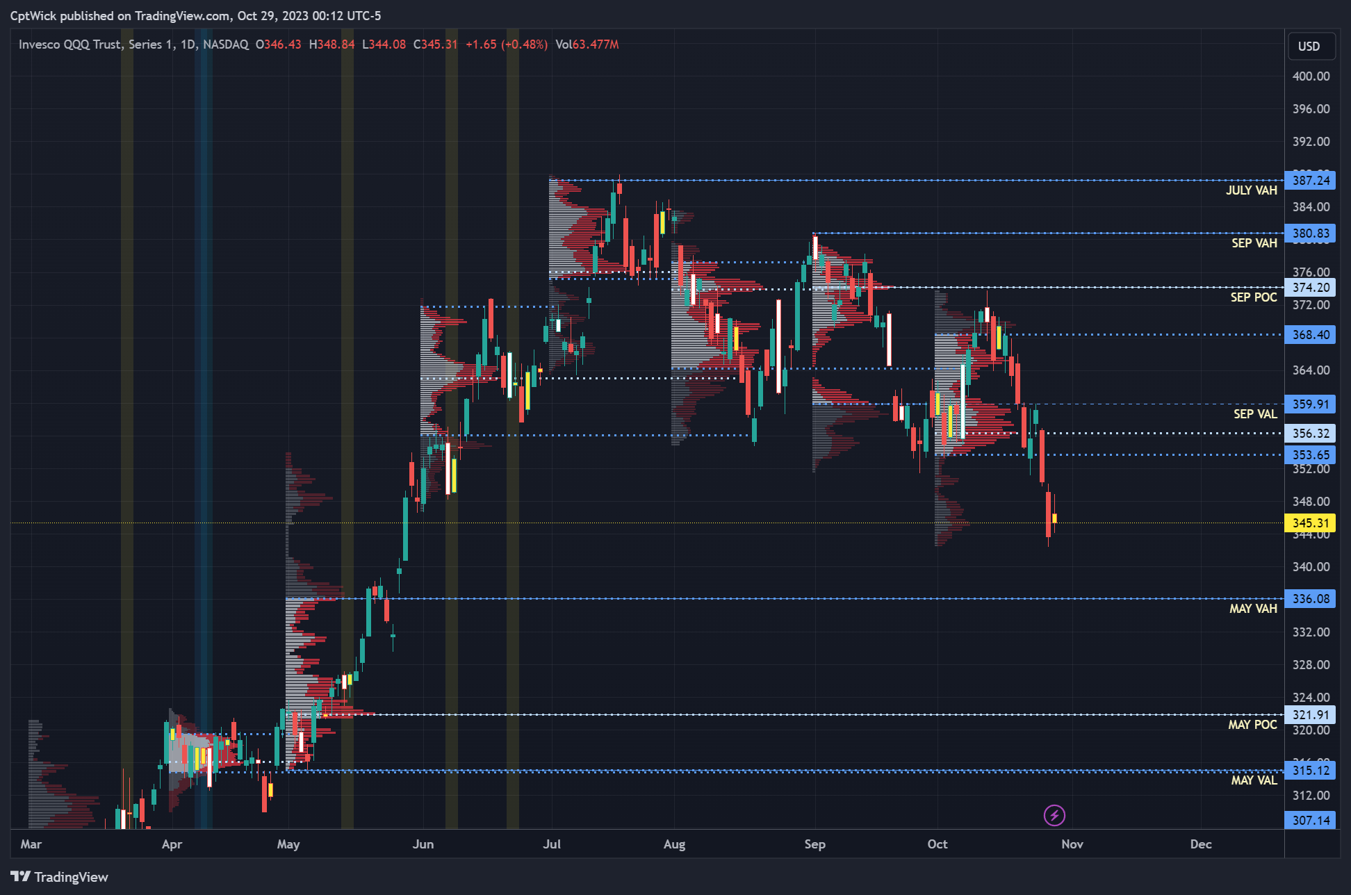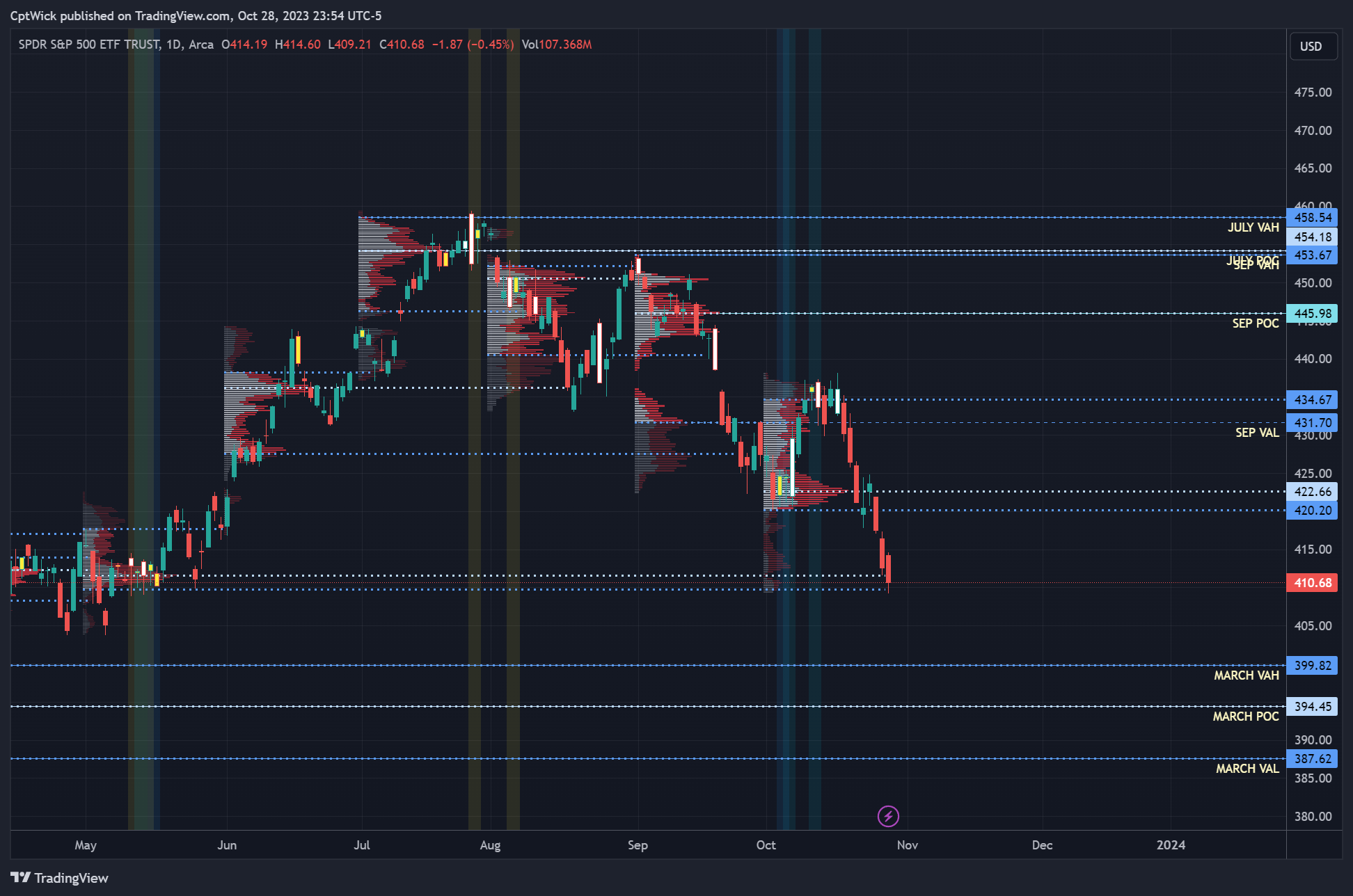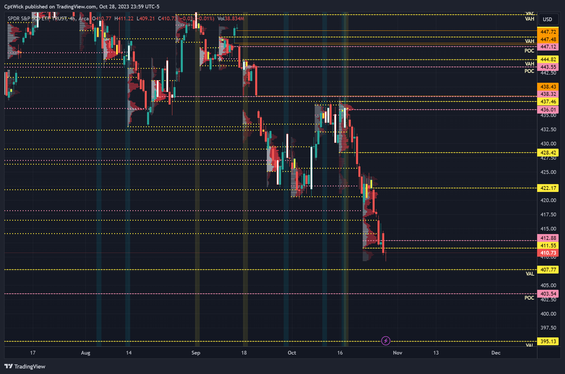 Last week we took out May’s POC and VAL, we are currently at a monthly imbalance to the downside, do we seek value back under 400? Or back up into Oct/Sept’s value area? We will have to see what happens.
