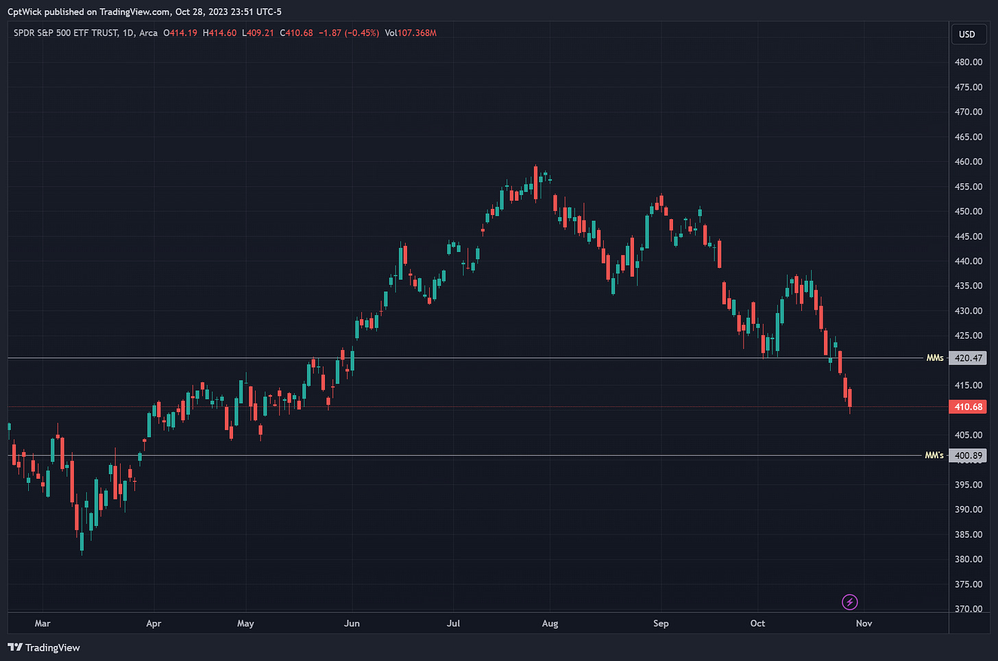 We have two trading sessions left in the month of October and it is pretty apparent who is in control. This week the MMs are expecting a range of $9.79. Giving us an upper range of 420.47 and a lower range of 400.89.