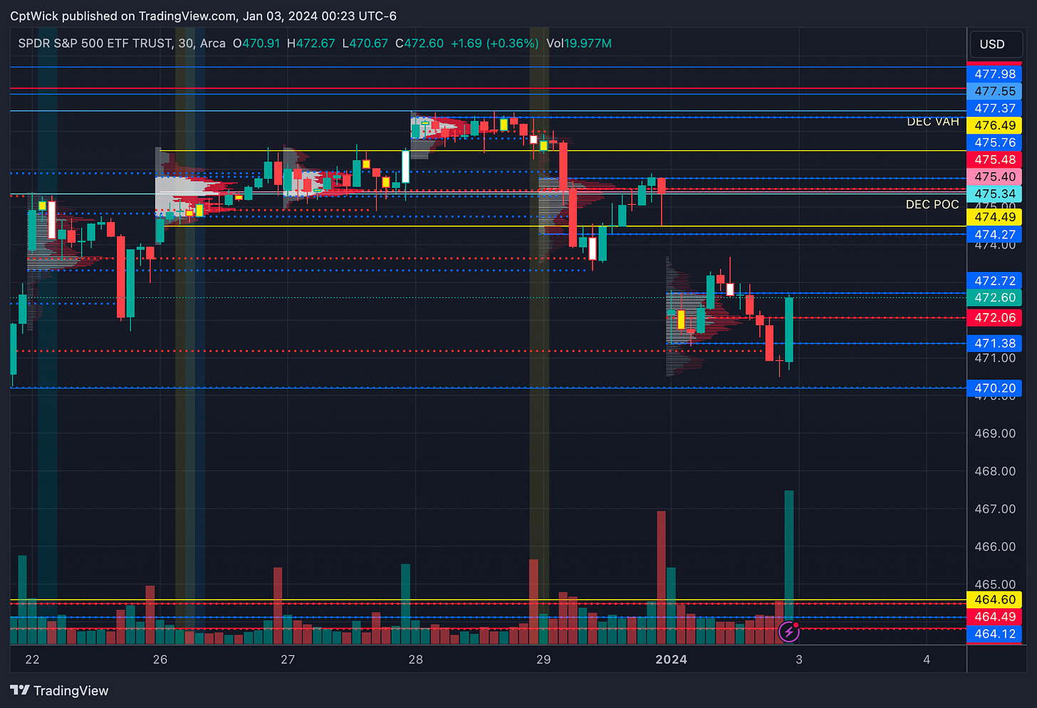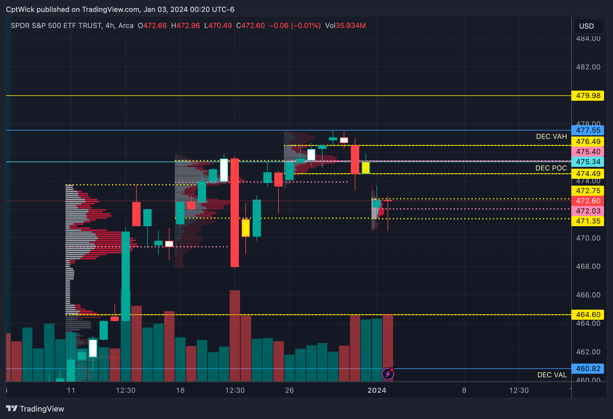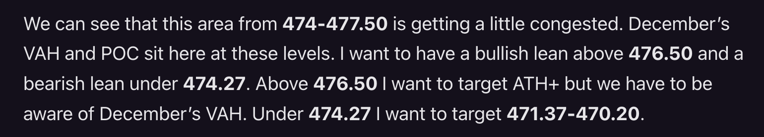 For tomorrow, above 472.72 I think we can make an attempt to see last week’s value area 474.49-476.49. If this area rejects it would confirm that we could head towards the 464 area. If it is accepted, we could see ATH’s. Under 470.20 I want to target 464.60. I think 468.50 could act as support and so could the lows from the week of 12/18 467.82.