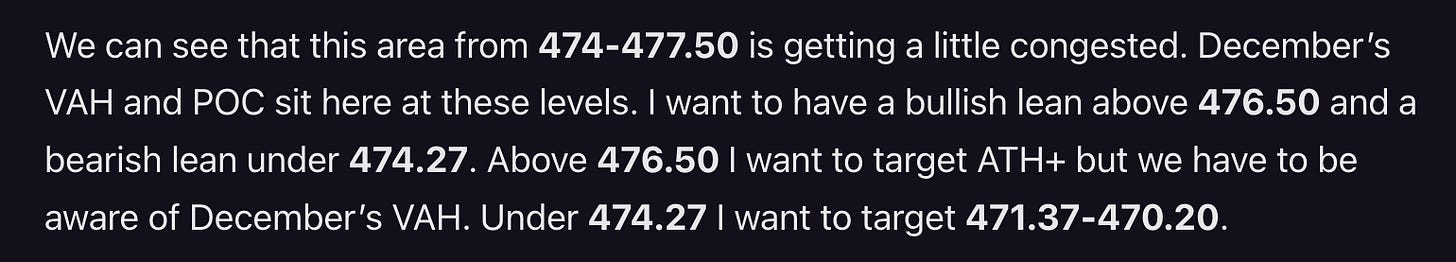 Yesterday’s levels were a success. I stated that I wanted to have a bearish lean under 474.27, we gapped under that at open and sold right down to my next key level at 471.37, in fact the initial balance low was 471.30. In the Substack chat I said this premarket.