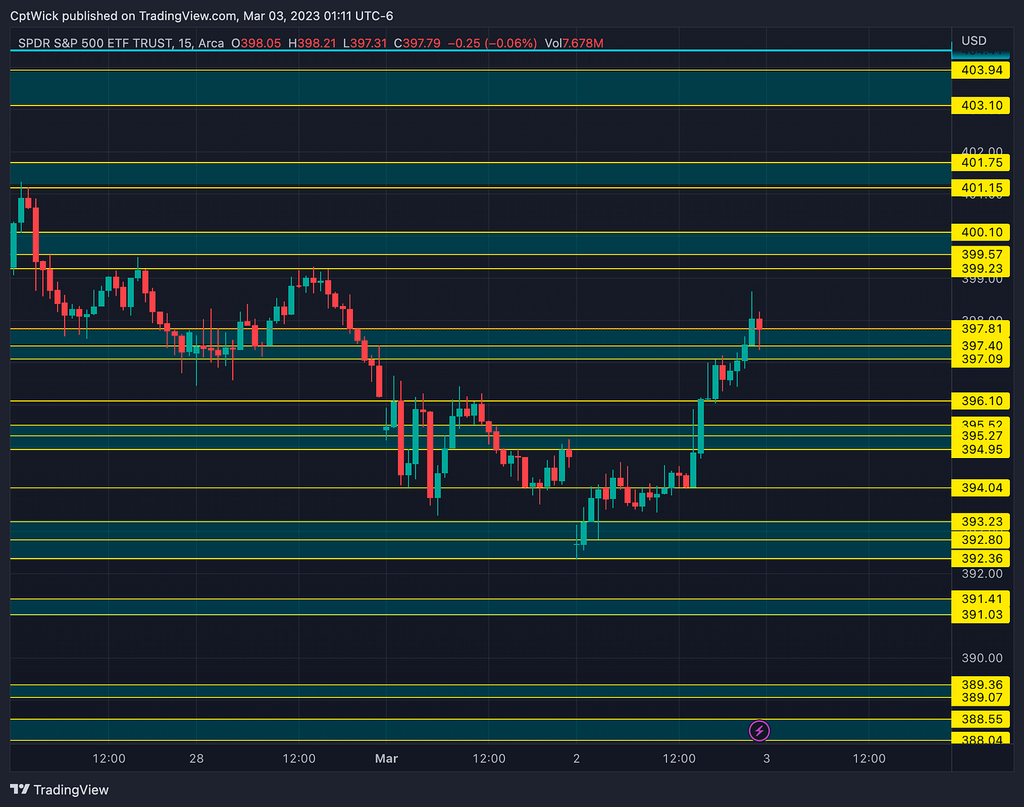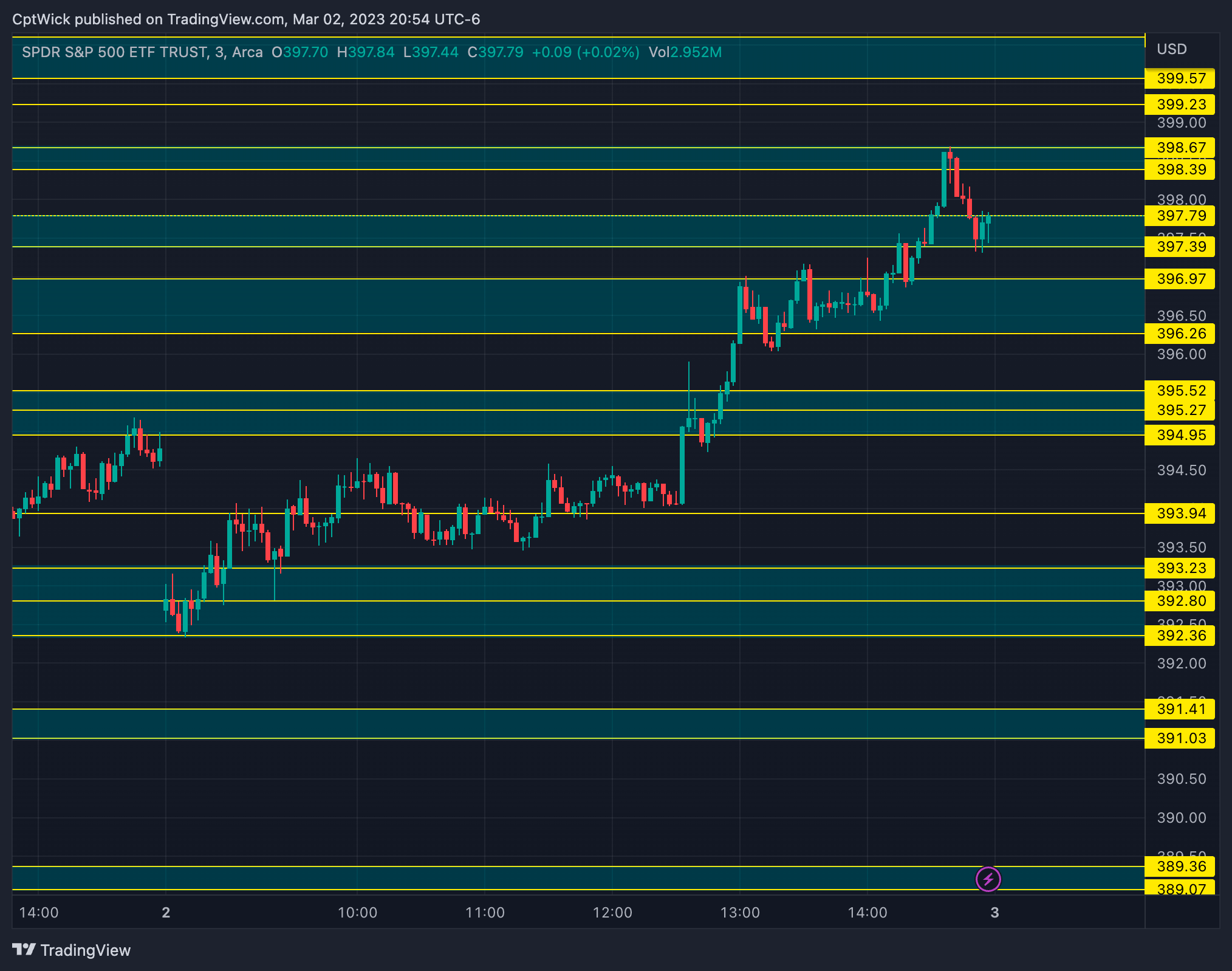 Here is a 3min chart with our levels from last nights plan. I have not changed or altered any of this, here is a link. Notice how the candles react when it comes into these levels, and more importantly, when it retests the key area. Study what the wicks are telling you, look at how price leaves comes into the level or “bus stop” if you will, and either consolidates inside the area usually hitting both sides and then it decides where its going. See how at the end of the day we blew past 397.79 and then extended right to the next level, just to come back and end the day. It’s truly remarkable.