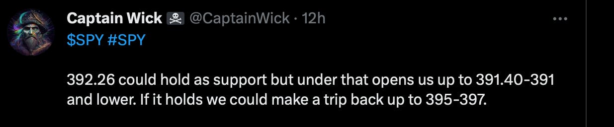 At the open, we gapped down right into the beauty zone 393.23-392.36, I even sent out a tweet here saying that if this holds, we are probably going up 395+, and if we lose this area I wanted to target 391 and under.