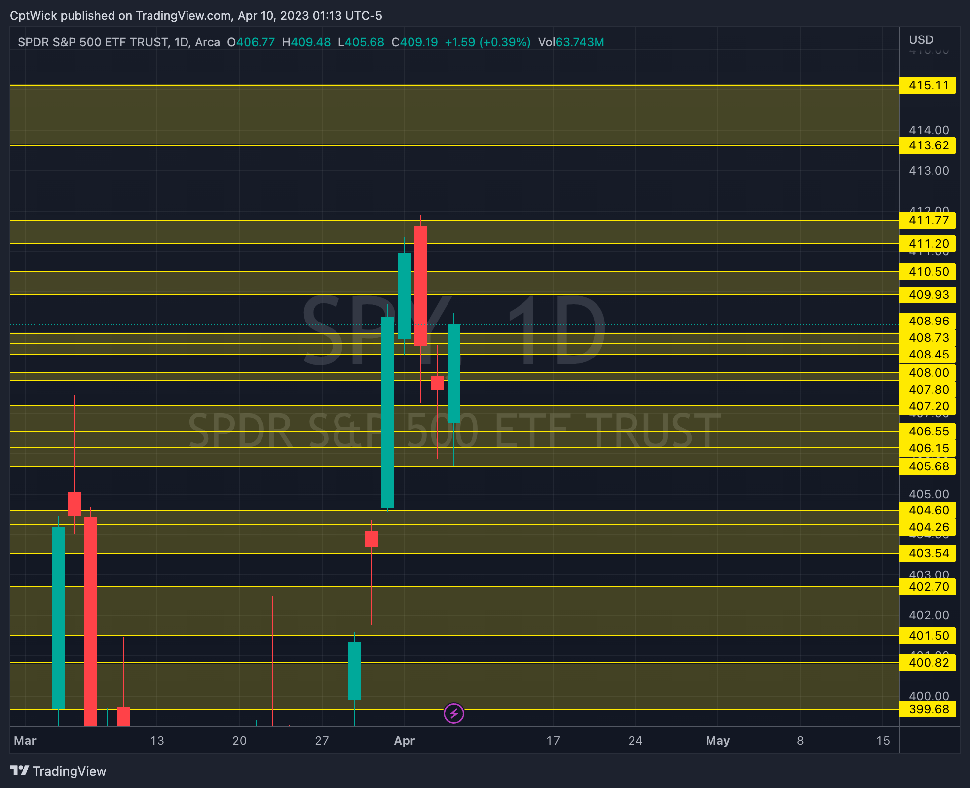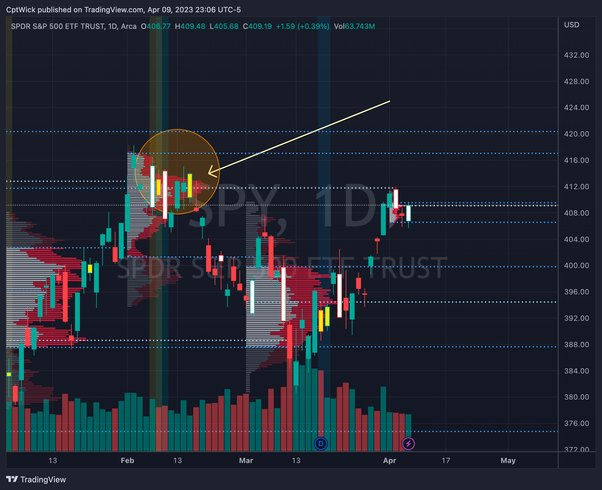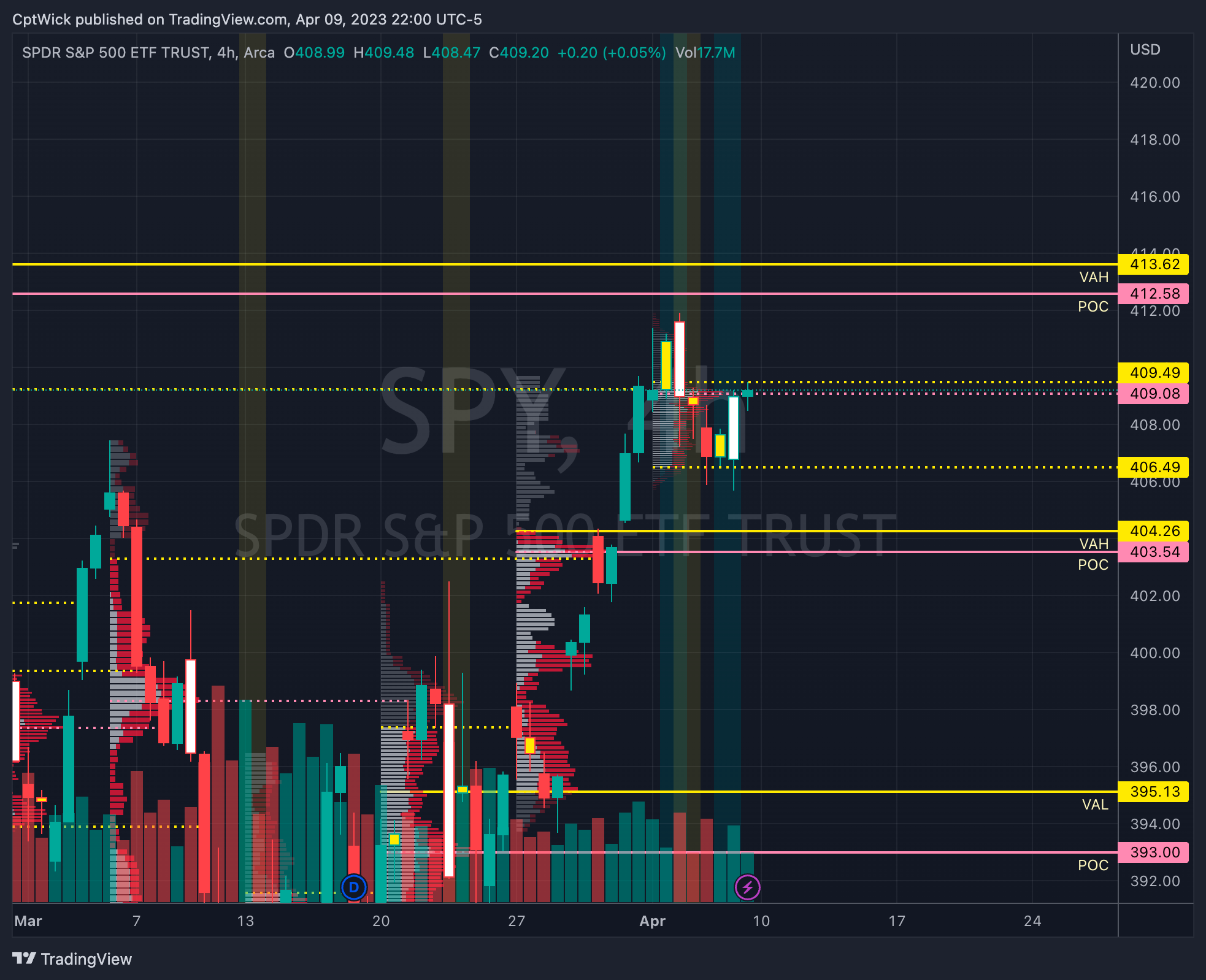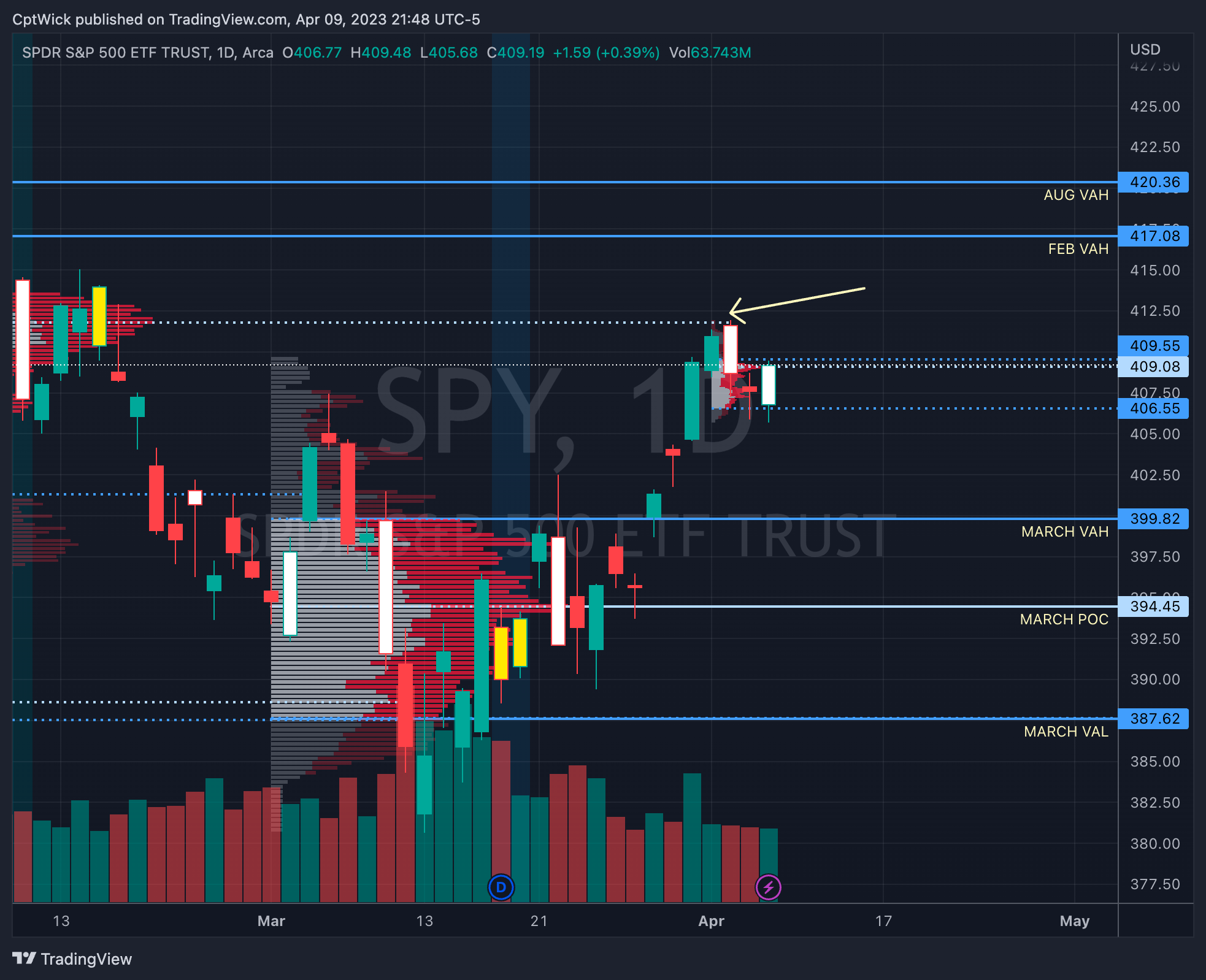 On the monthly volume profile we still have the rejection at February's POC 411.77, it is critical for the bulls to reclaim this if price is going to move higher. Last weeks plan I said that it was likely to balance under 408 and we tested the waters at 405.88 but they bought the dip. We are also balanced on the month, we want to see a move above 409.55 or 406.55.