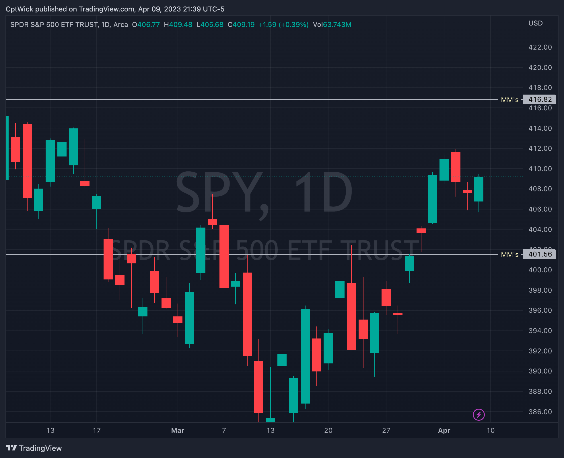 Last weeks short week is followed by CPI and more Fed. The MMs are expecting a weekly move of $7.63, the upper range is 416.82, and the lower range is 401.56.