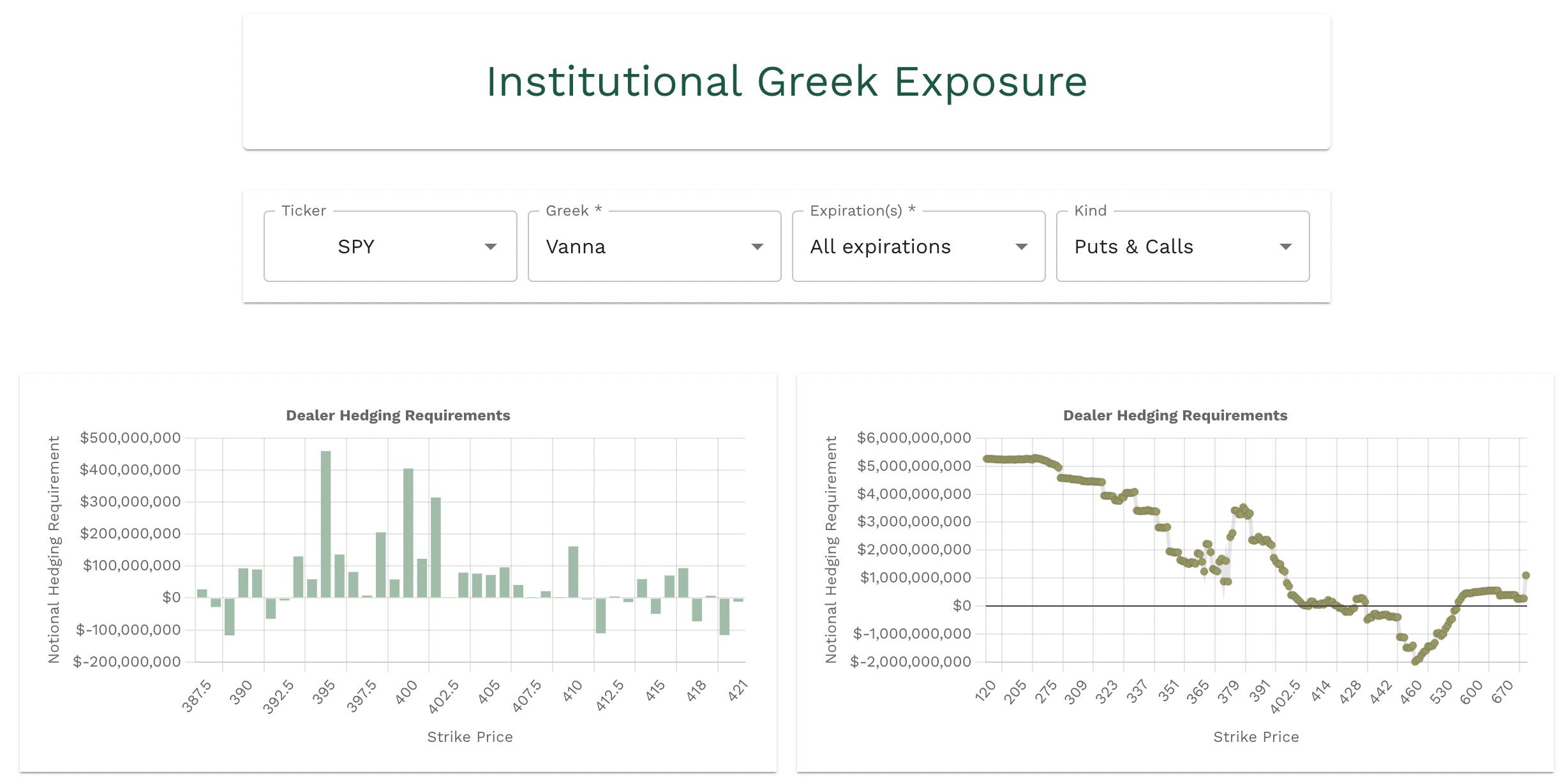 Gamma is showing similar levels, gamma is positive at 407.50, 410, 412.50, 414, 416, and to the downside 392 and 390. That 407 area is going to be key again this week, under 407 the bears can put the pressure on. Above 410 we have a chance to see 414+ based on current gamma.