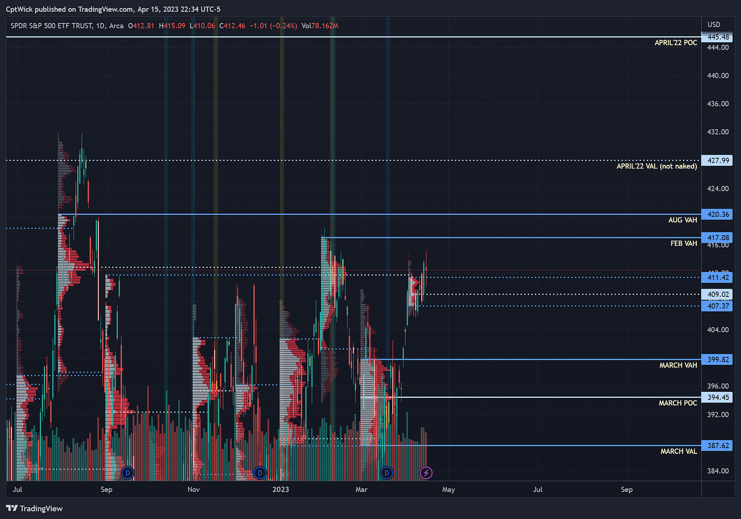 Looking at the monthly profile we can see that we have been building value just under Feb’s POC of 411.77, our current VAH is 411.42, POC is 409.02 and VAL at 407.37. We closed the session on Friday at 412.46, just above this value area. We also have 417.08 or Feb’s VAH within reach. August’22 VAH is at 420.36 and above that we have April of 2022’s value area right at 428. If we test that value area it will the 3rd attempt at cracking it since it was formed. If we can get accepted above that value, that would open the door to 445.48 the POC. If we push down under 407 we could revisit the March value area.