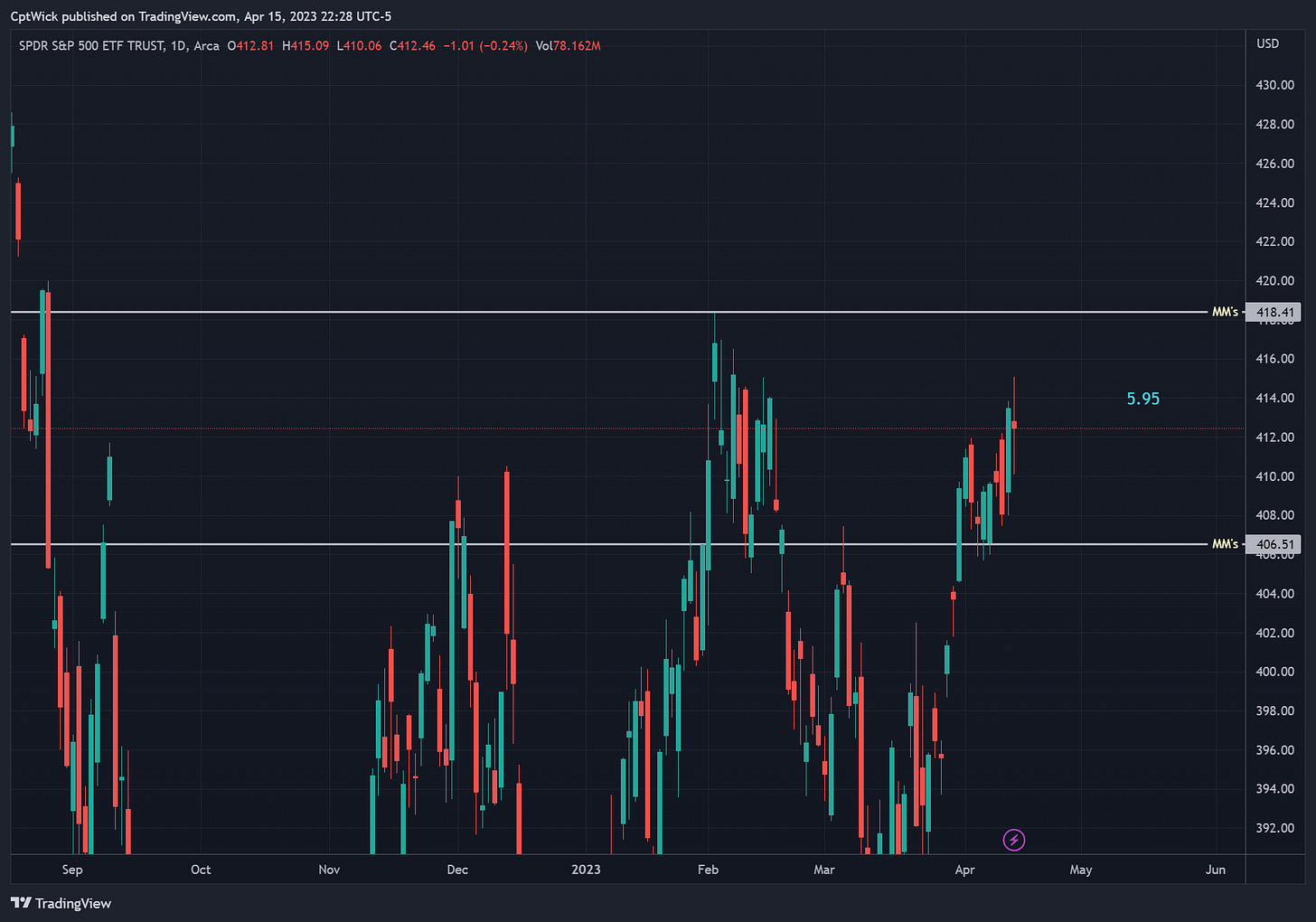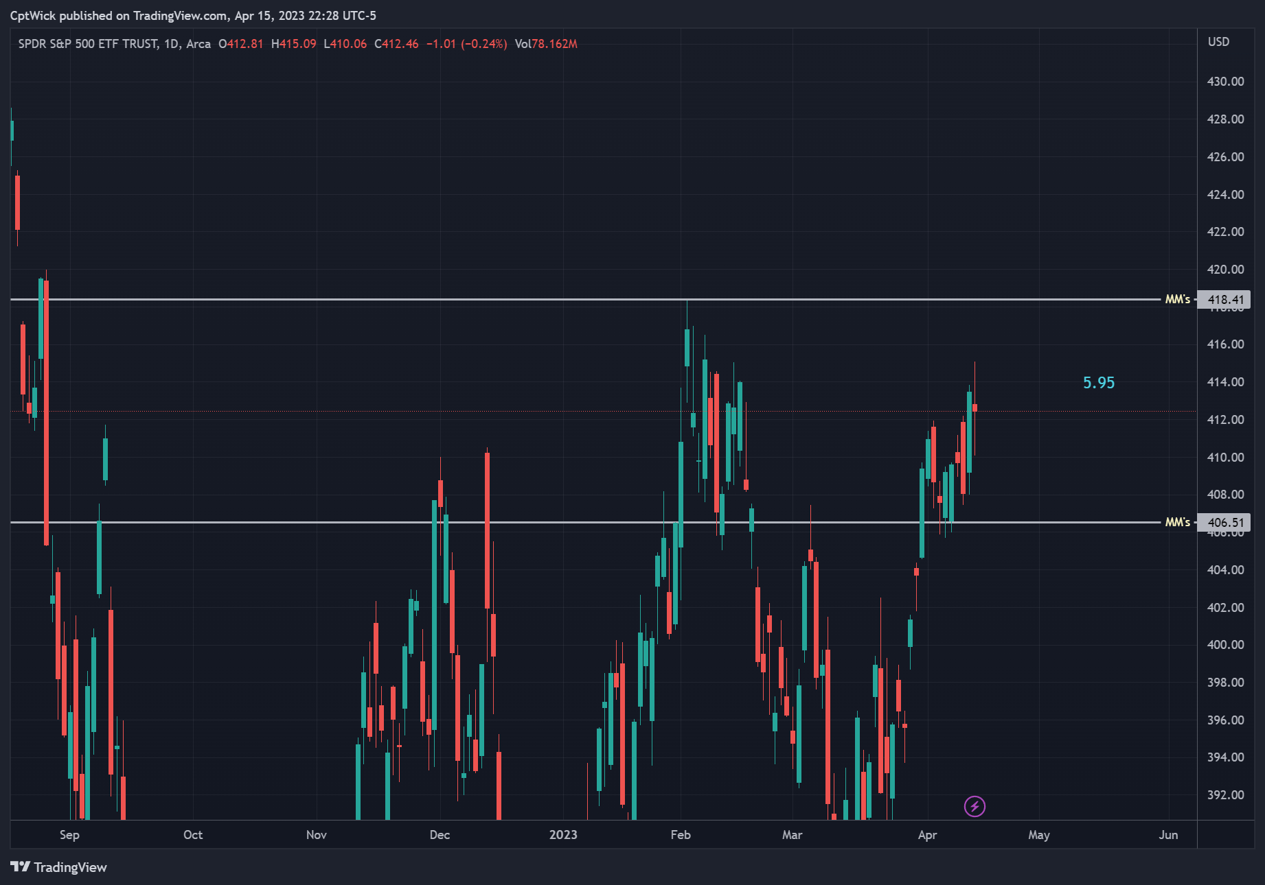 This week the MMs are only expecting a $5.95 move in SPY by Friday 4/21 giving us the top range of 418.41 and a lower range of 406.51.
