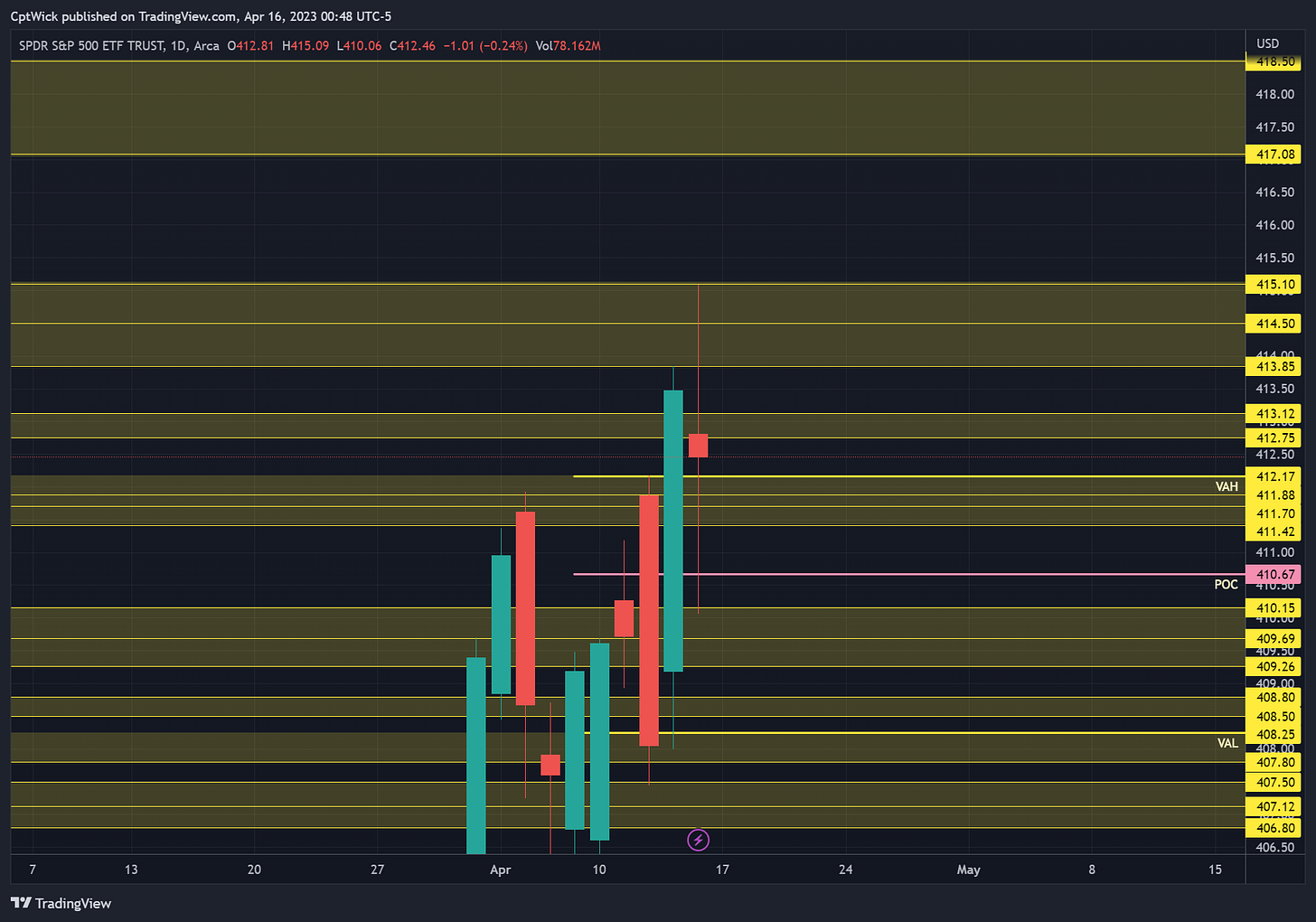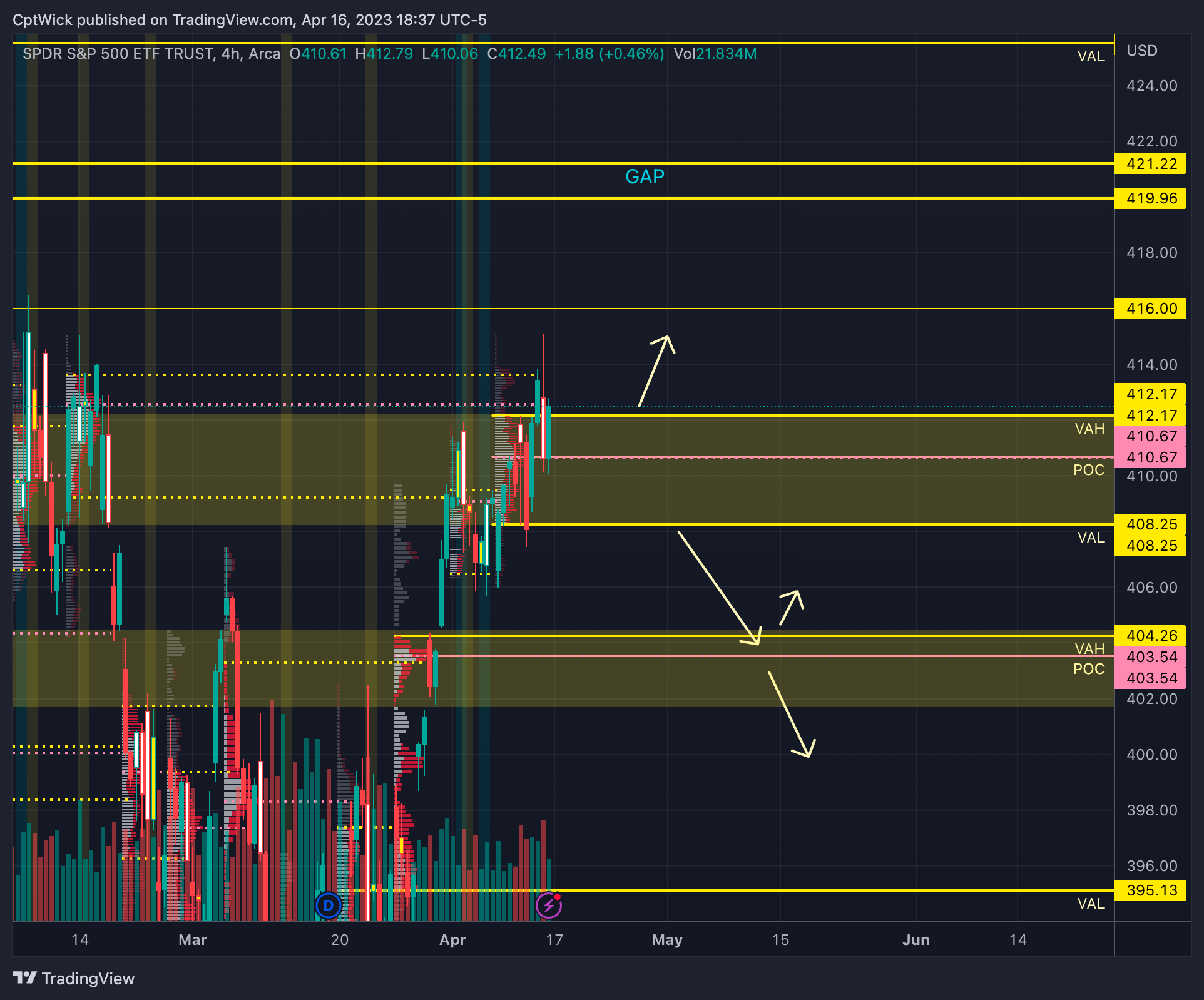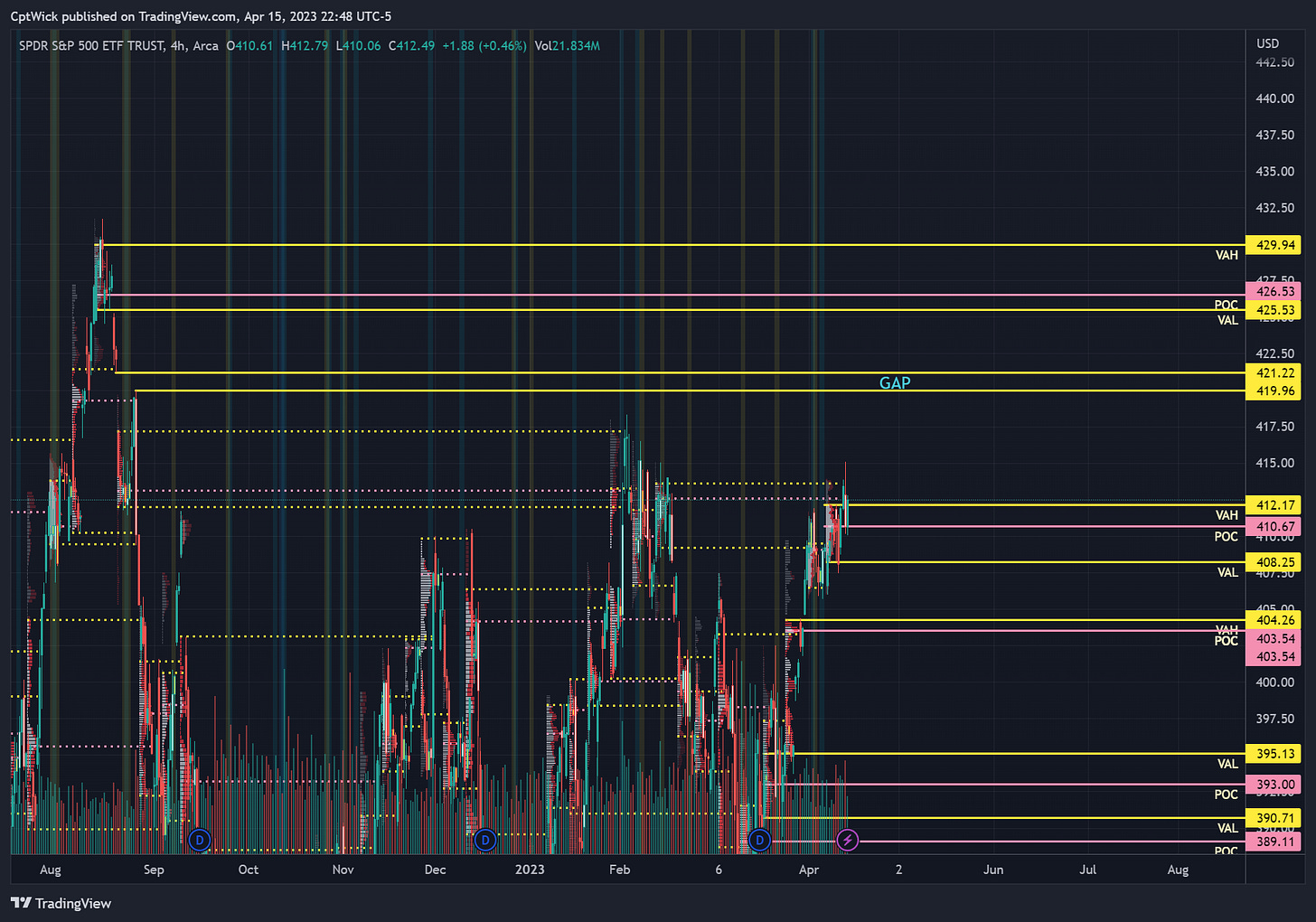 On the weekly profile, we closed just above last weeks value area (412.17 VAH). Our next naked value area is up at 425.53-429.94. We also have a nice gap on the 4hr chart sitting at 419.96-421.22. If last weeks value area can hold, we can push these levels. Our next naked value area below us is at 404.26-395.13, if we lose 408.25 we open the down to test that area.