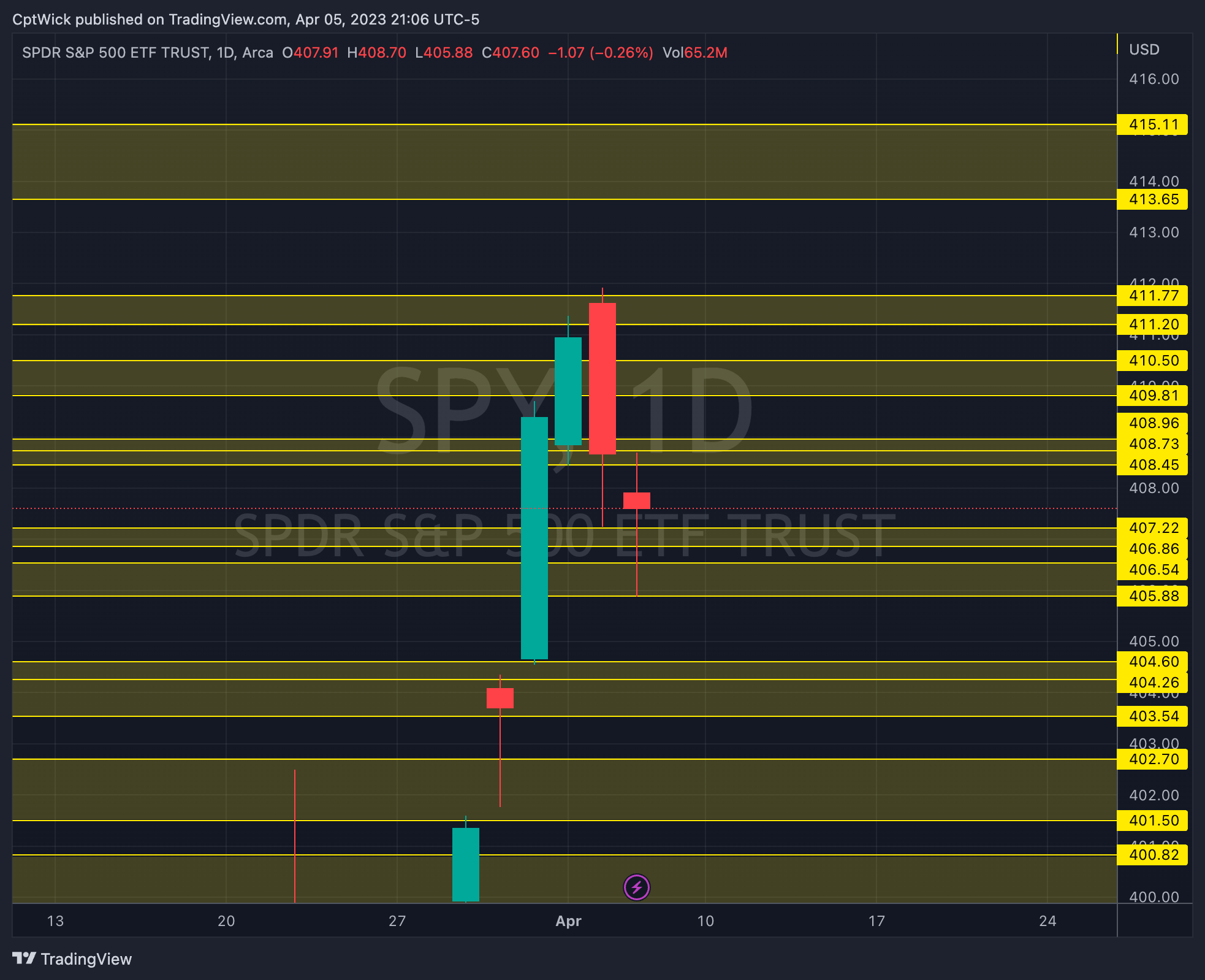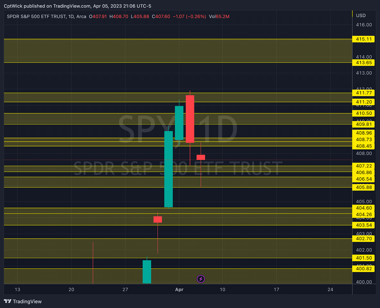 Today we finally broke down under 407.66 and the low of the week so far is 405.88. Although the data was not suggesting a bounce here, supply and demand ultimately won, as we rallied back to 407.66 but we closed under. I think it’s possible that tomorrow we have some more downside, but we need to do our homework.