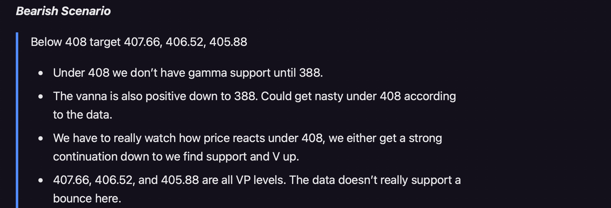 This is a very similar look to Sunday night going into Monday’s session. If this is true, I would look for 407 to hold and for them to pin us somewhere between 407-414, maybe around 410-411, I will not be taking a trade based on this Information alone. I will play it primarily via volume and price. But I will be extra caution in my decisions around 407.