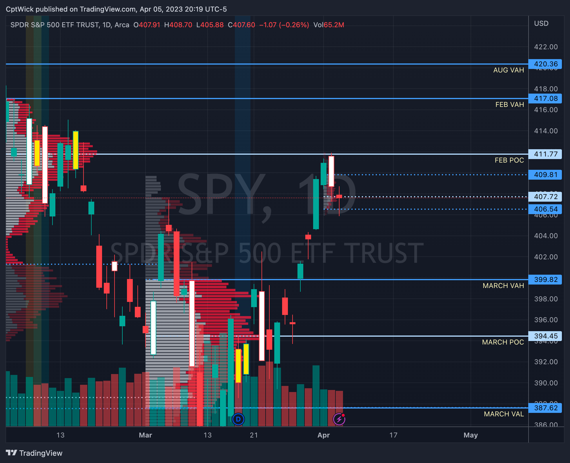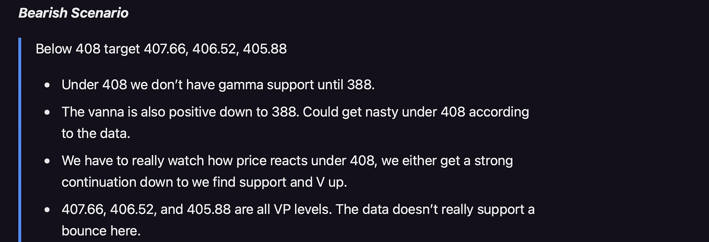 Check out this weekly volume profile. We busted into value at 409.22, we then made an attempt to get to the naked POC at 412.58 (we also were fighting a bigger POC in 411.77 (Feb’s POC)). This value area got rejected because we fell back out of value, we could be headed down to 404.26-403.54, Under 403.54 we could get more selling pressure towards 395.13 (not 0dte). Unless the bulls can take back 408.45 (this POC is dynamic, meaning it can change tomorrow if we get heavy volume).