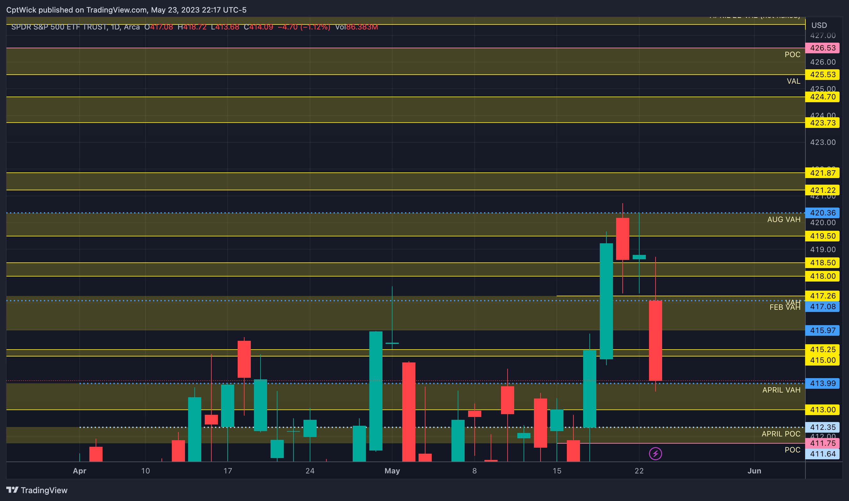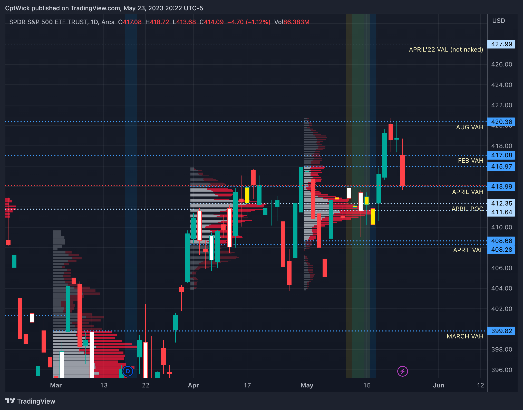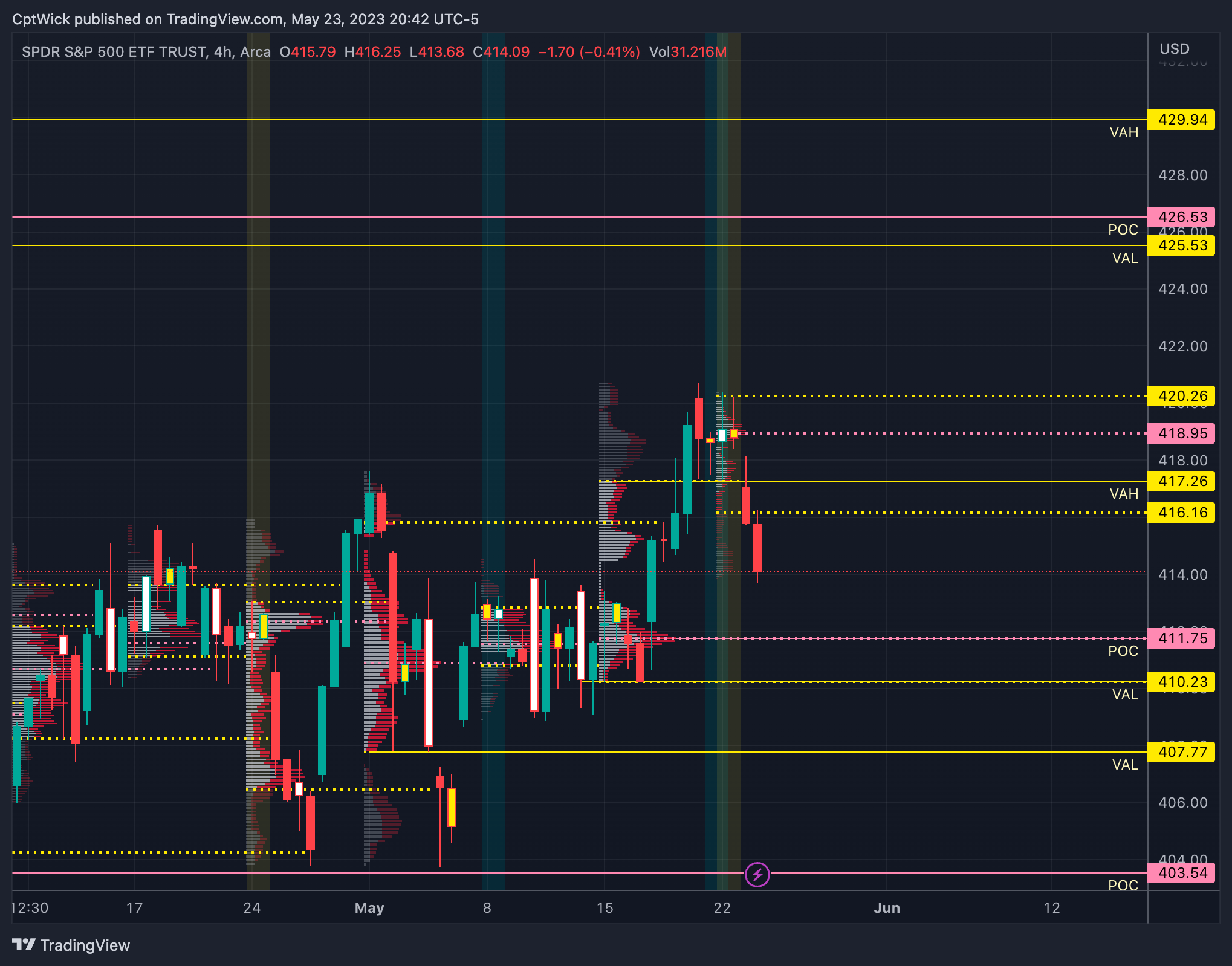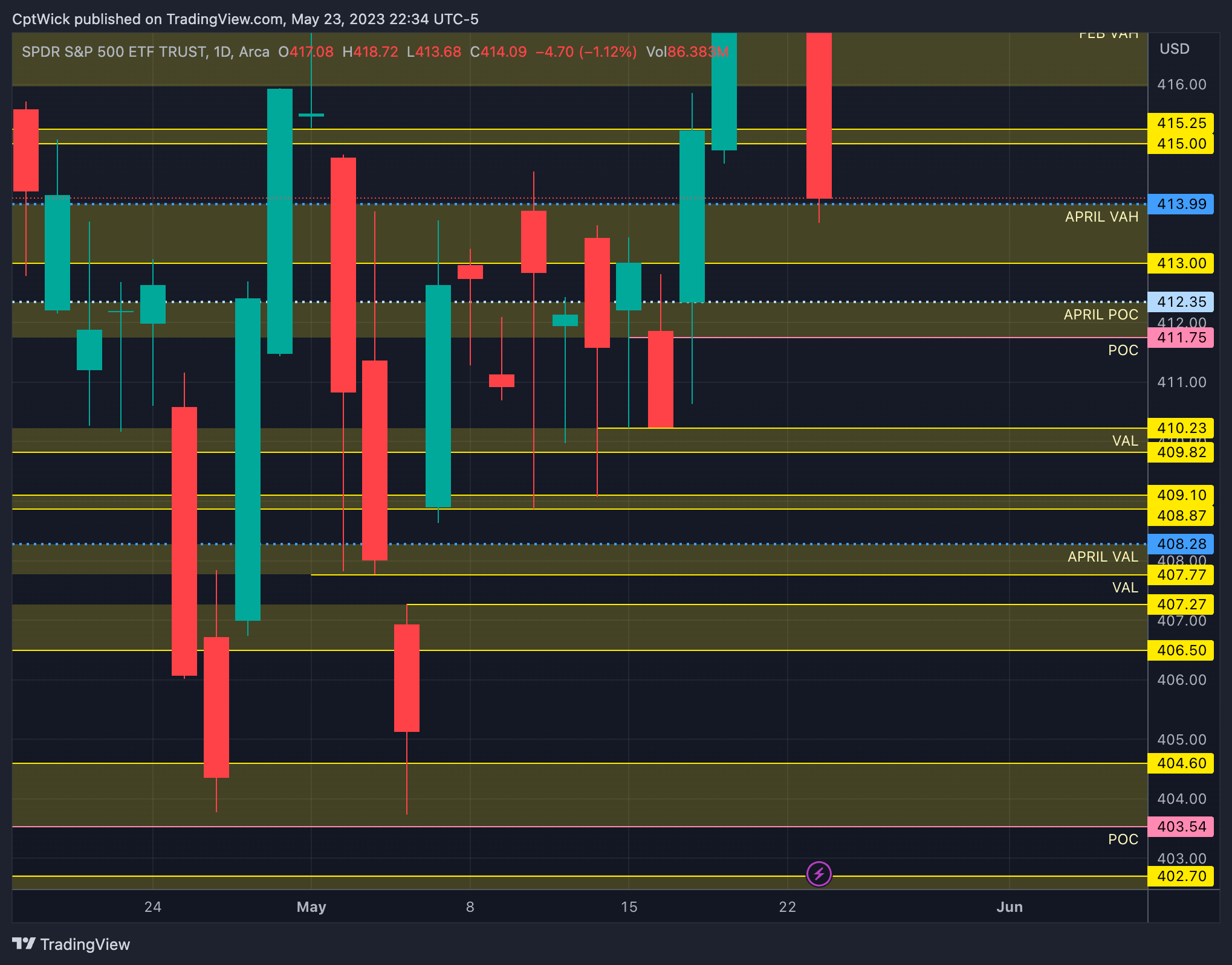 The big take away from this plan is this, if I am a bull here, I want to see 414-412 hold, if we start pushing down towards 408 we run the risk of trading 403. 414 is a MASSIVE level in terms of the volume profile. If they want to full rotate through April’s value area and the dreadful 412 zone…. 408.28 is that VAL. If 414 holds and we can take back 417, I think we might go and test 420.36 again and possibly 425-426. Be safe out there, crazy news can cause a violent move in any direction. I hope you can find value in these plans, I do them for myself and the few I trade with on a daily basis but I upload them here to keep myself accountable! Enjoy!