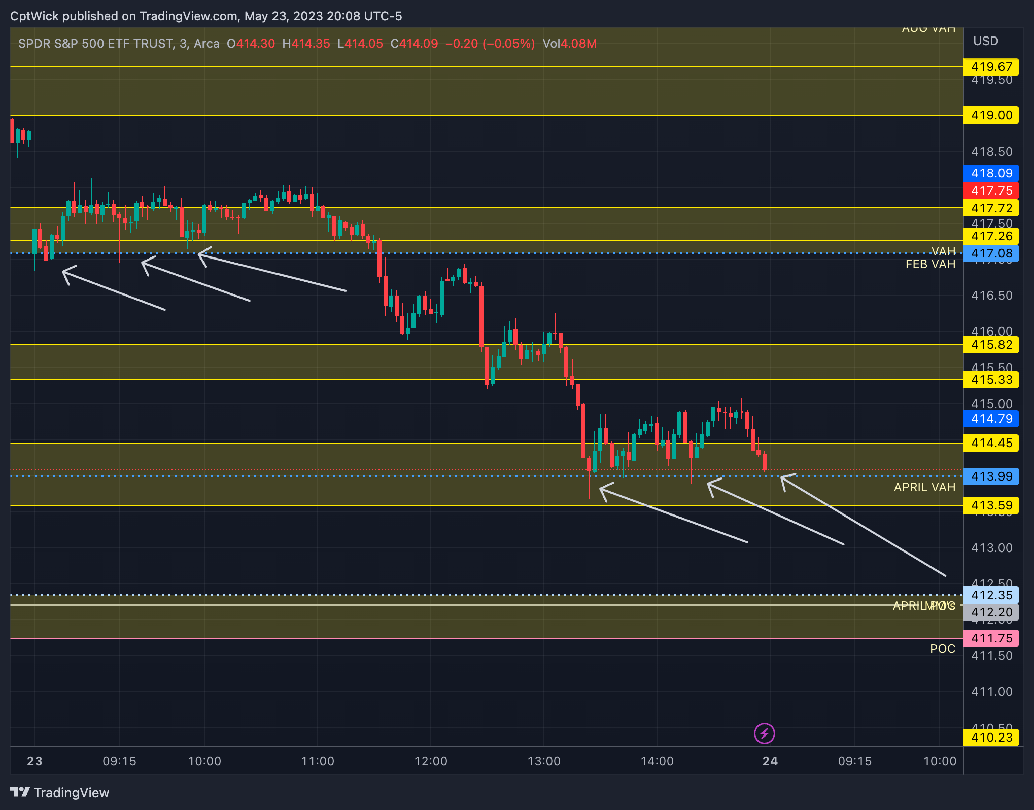 We will break down the charts next, why is 414 important? If you have been following along over the weeks you know that 413.99 is April’s (last month) value area high (VAH). You can see from this chart below, how well these levels are respected. The bears defended that Aug 22’ VAH twice and brought price back into balance under the Feb VAH and the current (May) VAH at 415.97. The current Point of control (POC) sits at 411.64 and the VAL is at 408.66. These are very similar levels to April’s value area. Price is either going to use this area (414-411) as support or its going to eventually turn into resistance.