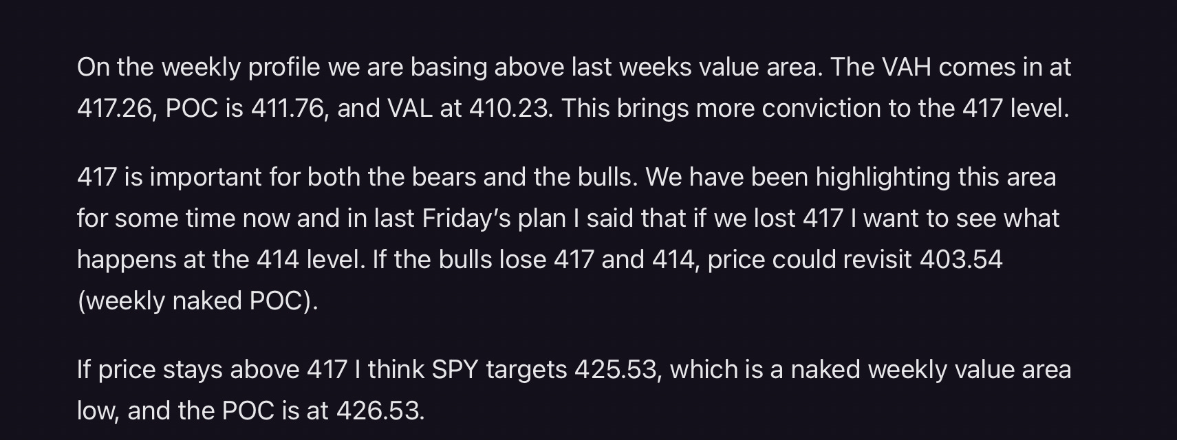 If we look at the weekly profile you can see that we were trying to build value above last weeks VAH at 417.26. The weekly imbalance to the upside was brought back into value. This weeks VAL currently sits at 416.16, that paired with last weeks VAH at 417.26 will become a key level for the bears to defend if they want to send prices lower. We have that naked POC at 403.54 that we need to one aware of.