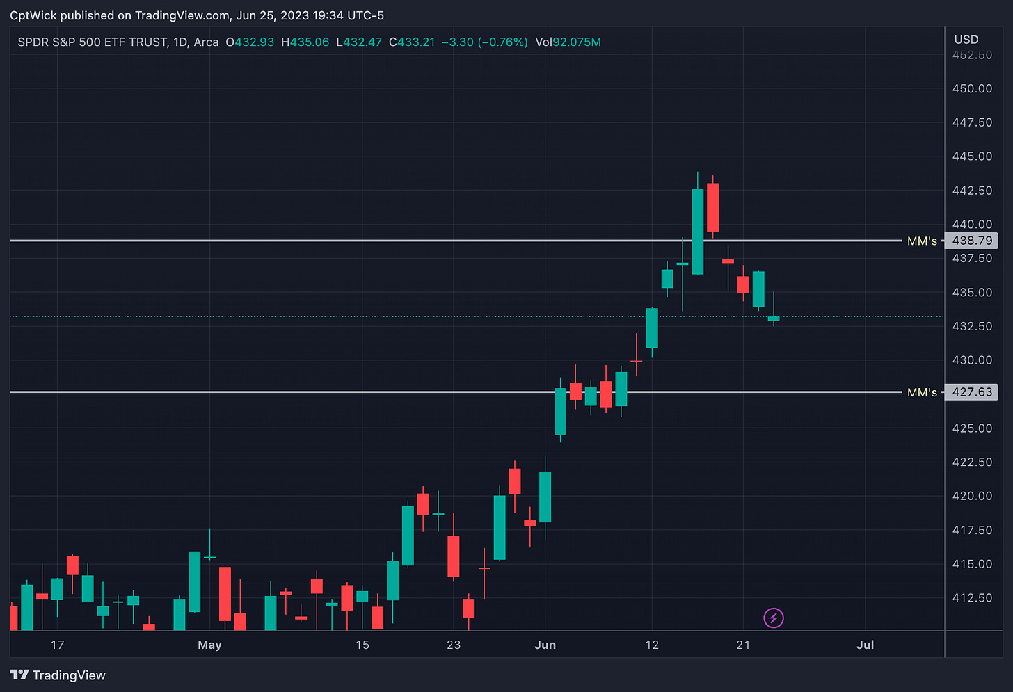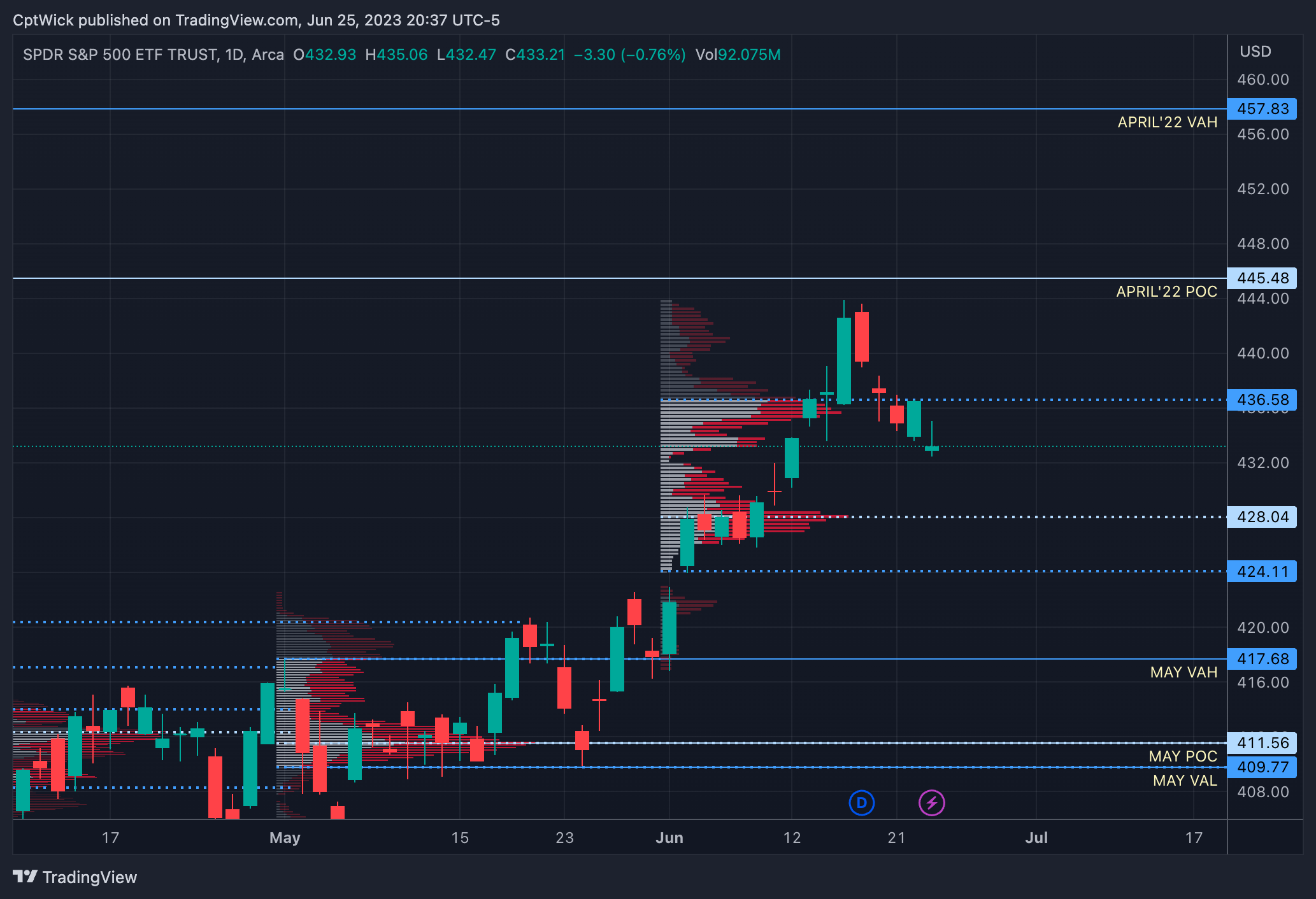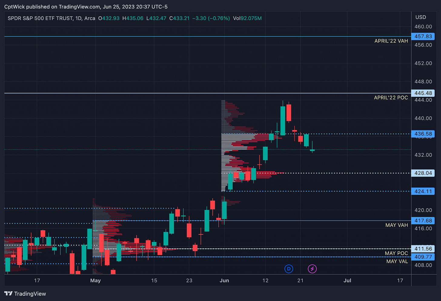 We also have some gaps to fill to the upside above this value area. there is a small one at 436.99-437.10 and we also have one at 438.37 and 438.97. The closest gap to the downside sits at 423.95-422.92 as we highlighted last week. Here is a wider view.