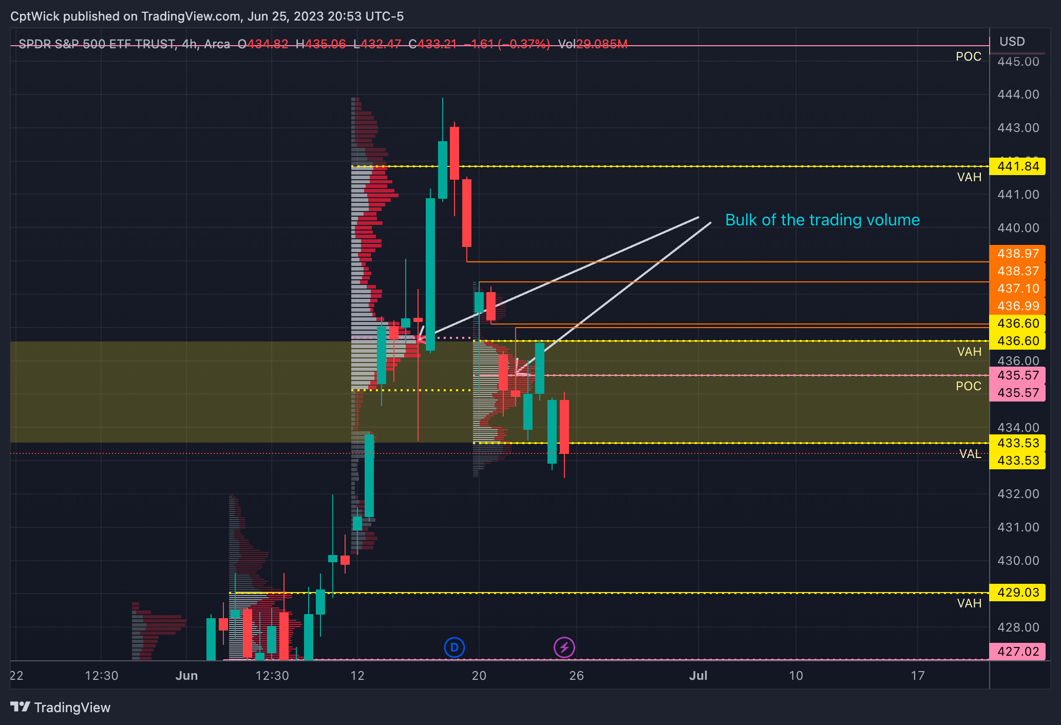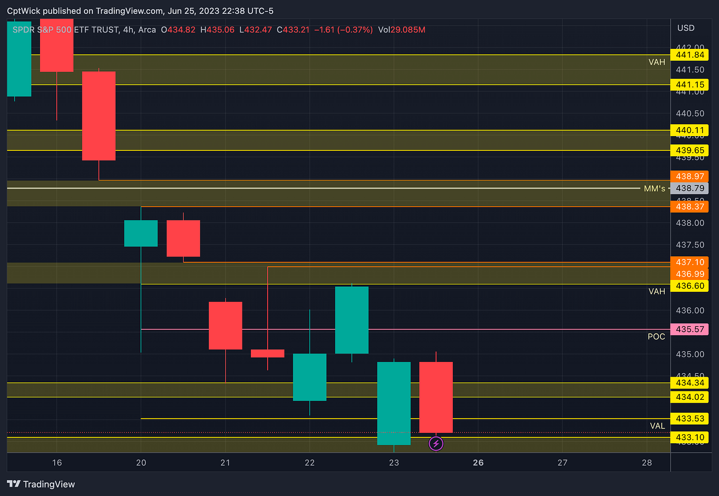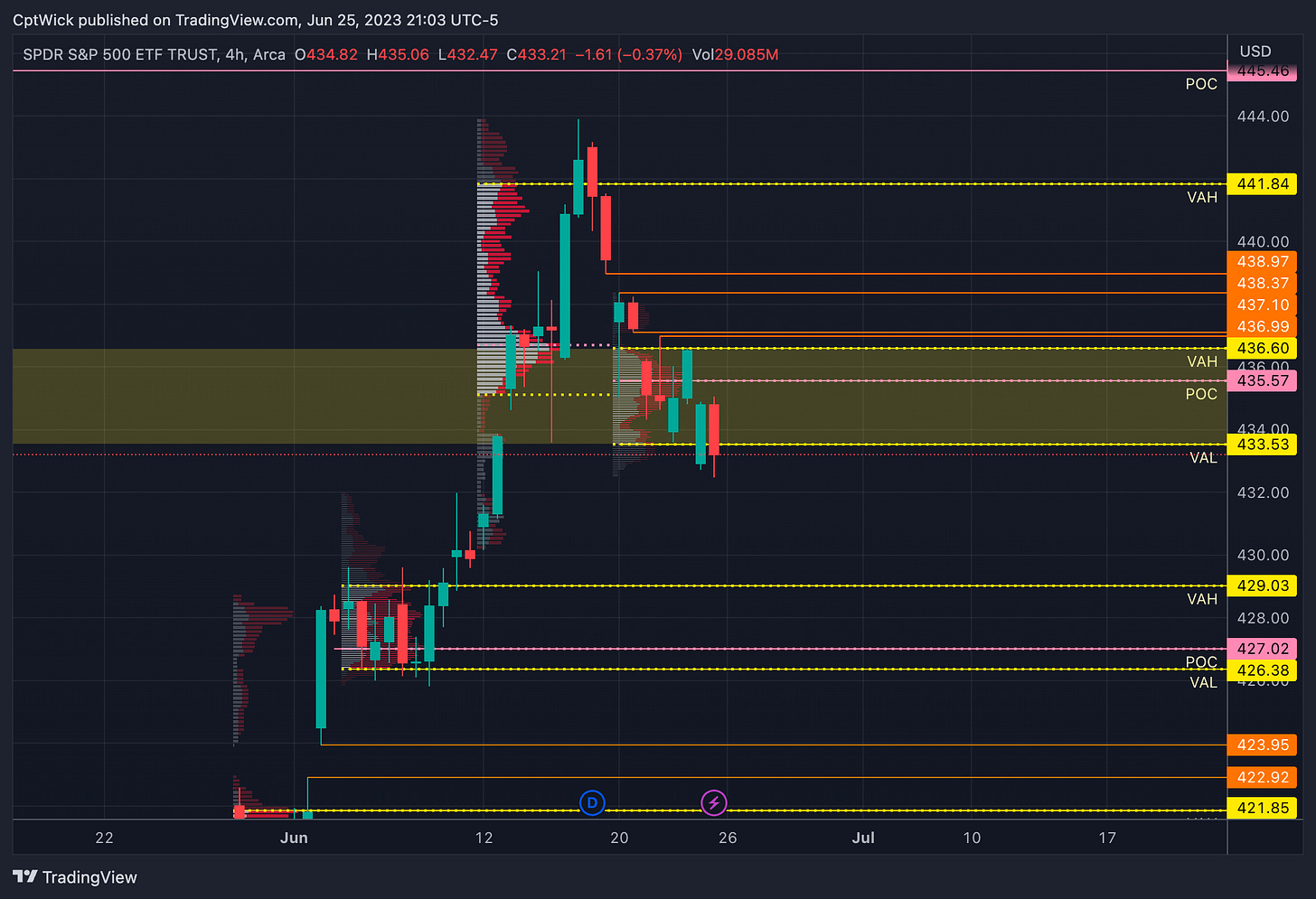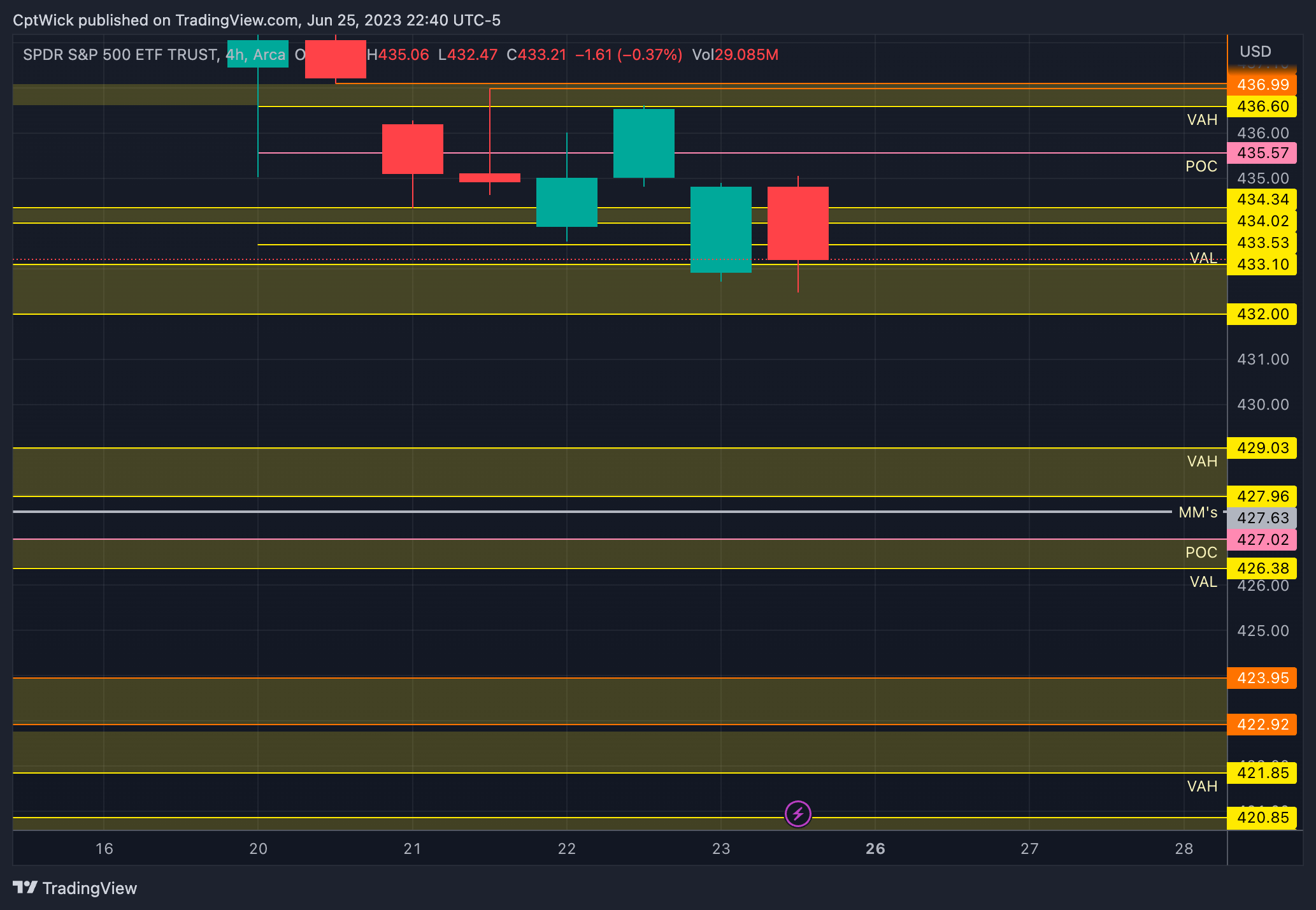 The big area that I am interested in this week is last weeks value area from 433.53 to 436.60 and I think this area is the key going forward. Pay attention to how price reacts to this zone. We want t be short under it and long above it, be careful trading within it because it could be choppy.
