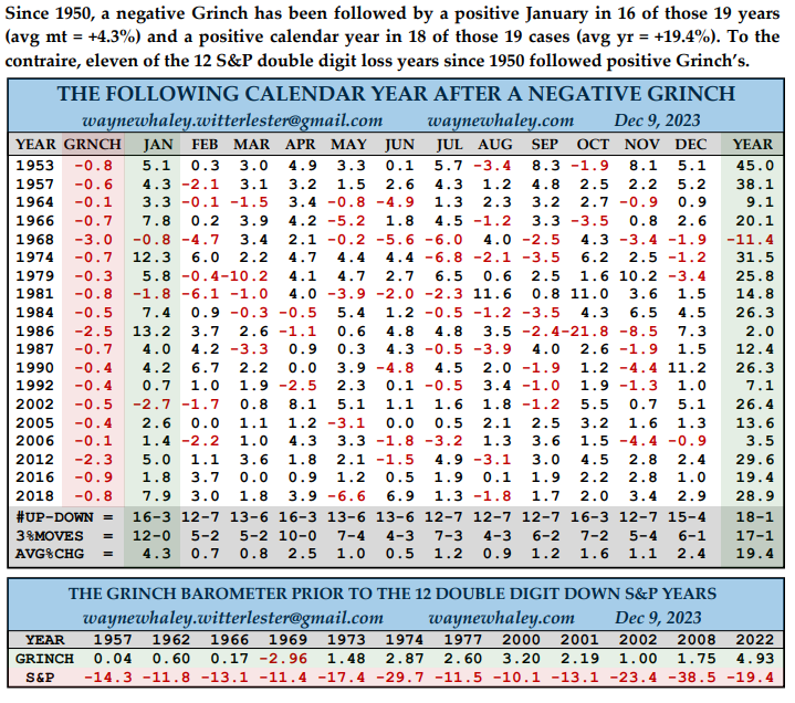 Here is the first view of historical data shared by Wayne Whaley on X - where if we had a negative Grinch - ie the 3 trading days before and after Christmas - then we have had a positive January 16 times up and 3 times down. Additionally, if the Grinch does show up we then have a positive calendar year with an avg increase of 19.4%! Wow! That would put us way past ATH’s and then some - that sounds exciting right!