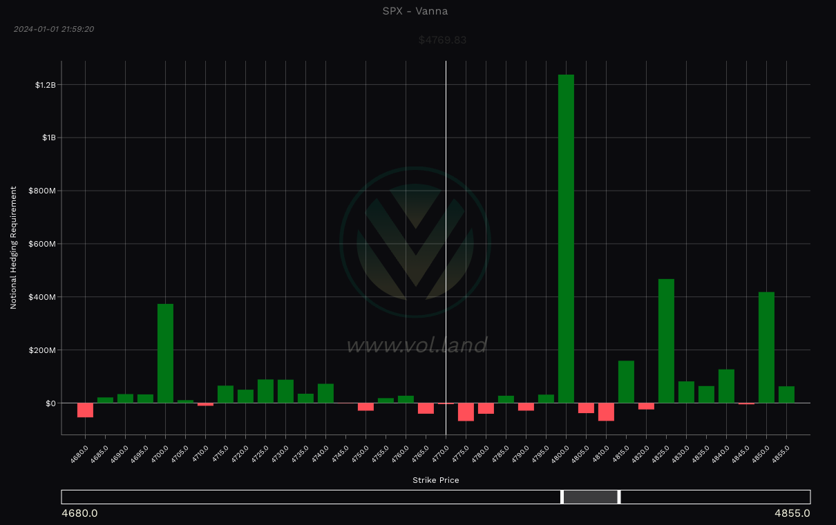 4780-4800 - This is the big zone where dealers are just not ready to push price above with the massive amount of positive vega sitting at the 4800 level - it has over $448b worth of positive vega sitting there.