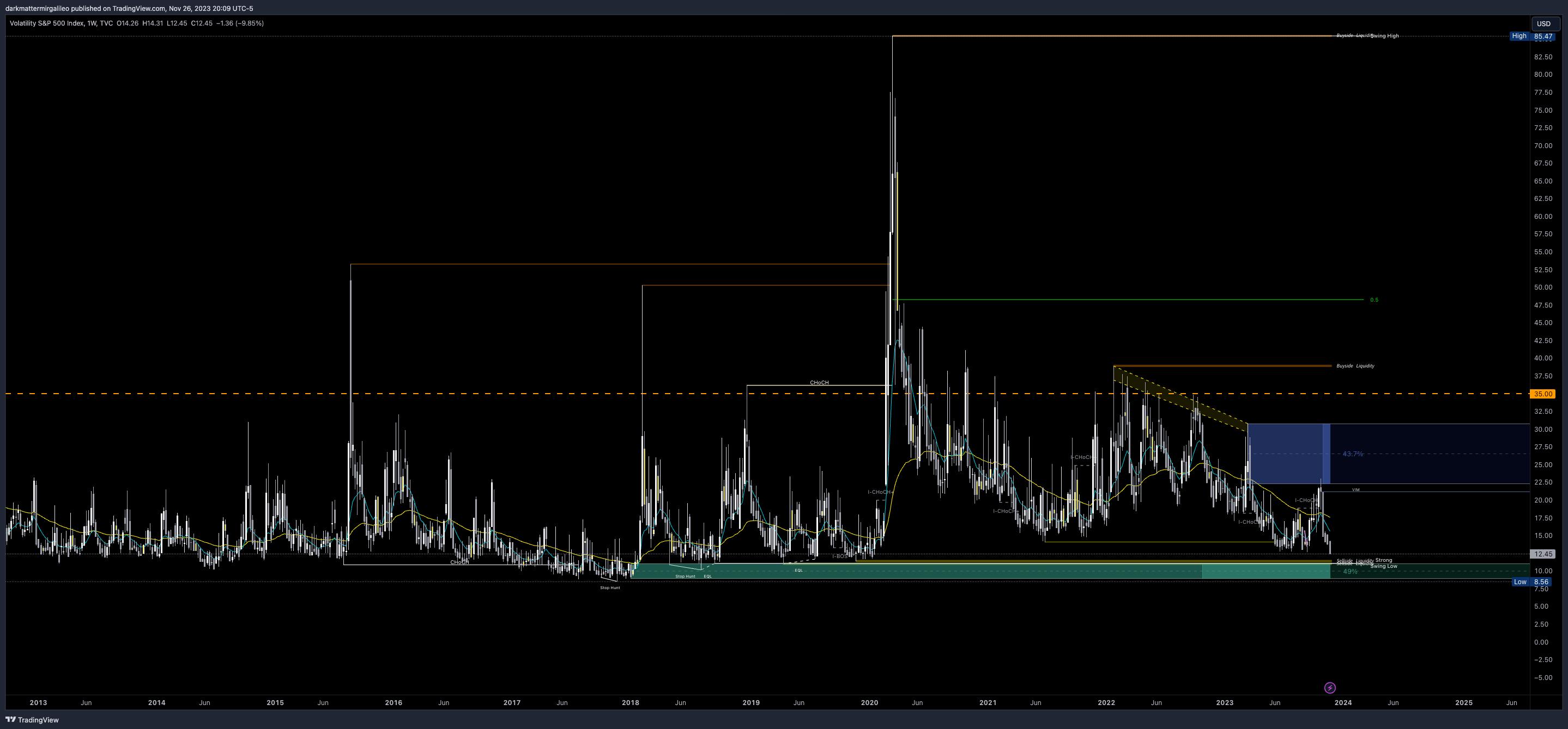 Additionally, I want to take a look at the VIX. If we take a look at the weekly chart and zoom out you can see we are at the lows in the VIX where we typically get more volatility. Doesn’t mean we can’t see a VIX between 9 and 11, but I think we are going to see some reversion in it. It could go sideways for a few days and then breakout.